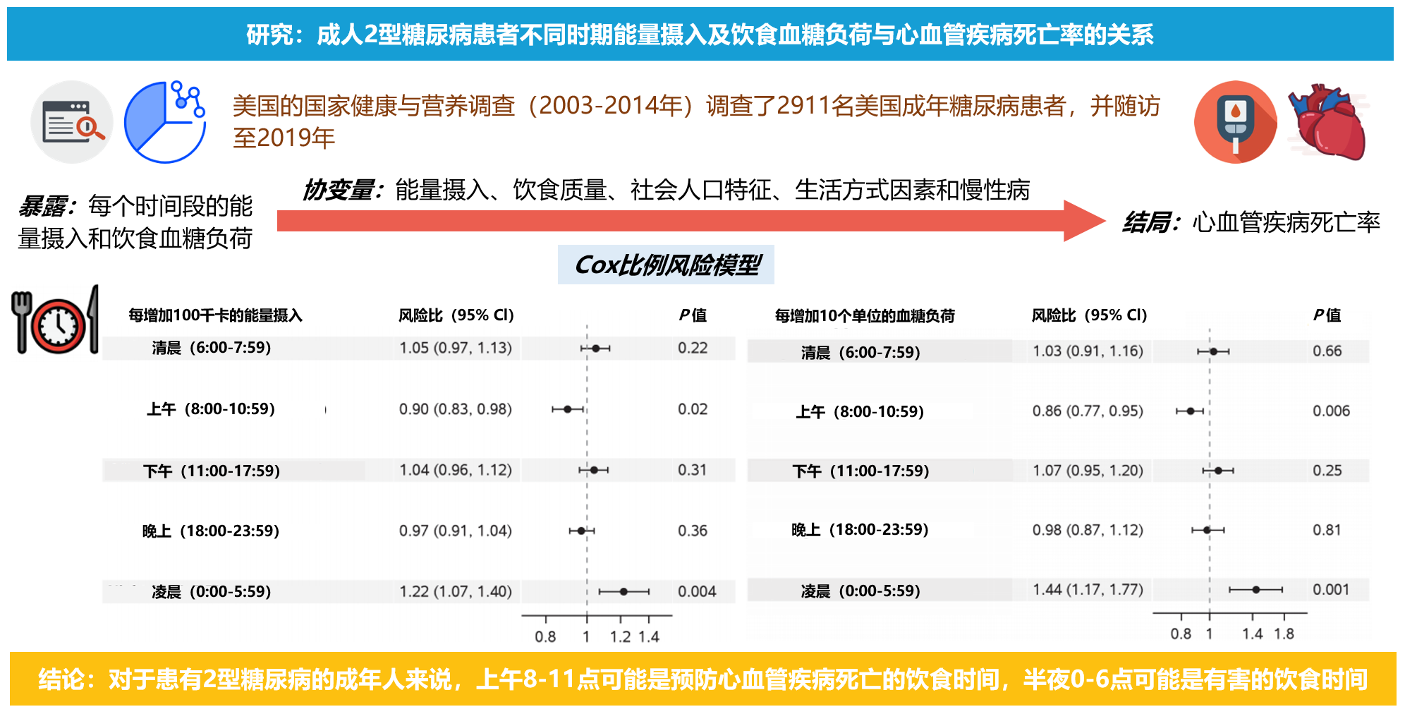 2024年12月,《Diabetes Care》期刊上发表了一项糖尿病患者进食时间的研究,这项研究覆盖了2911名美国成人2型糖尿病患者,追踪时间长达9年。研究发现,进食时间直接影响糖尿病患者的心血管疾病死亡风险。